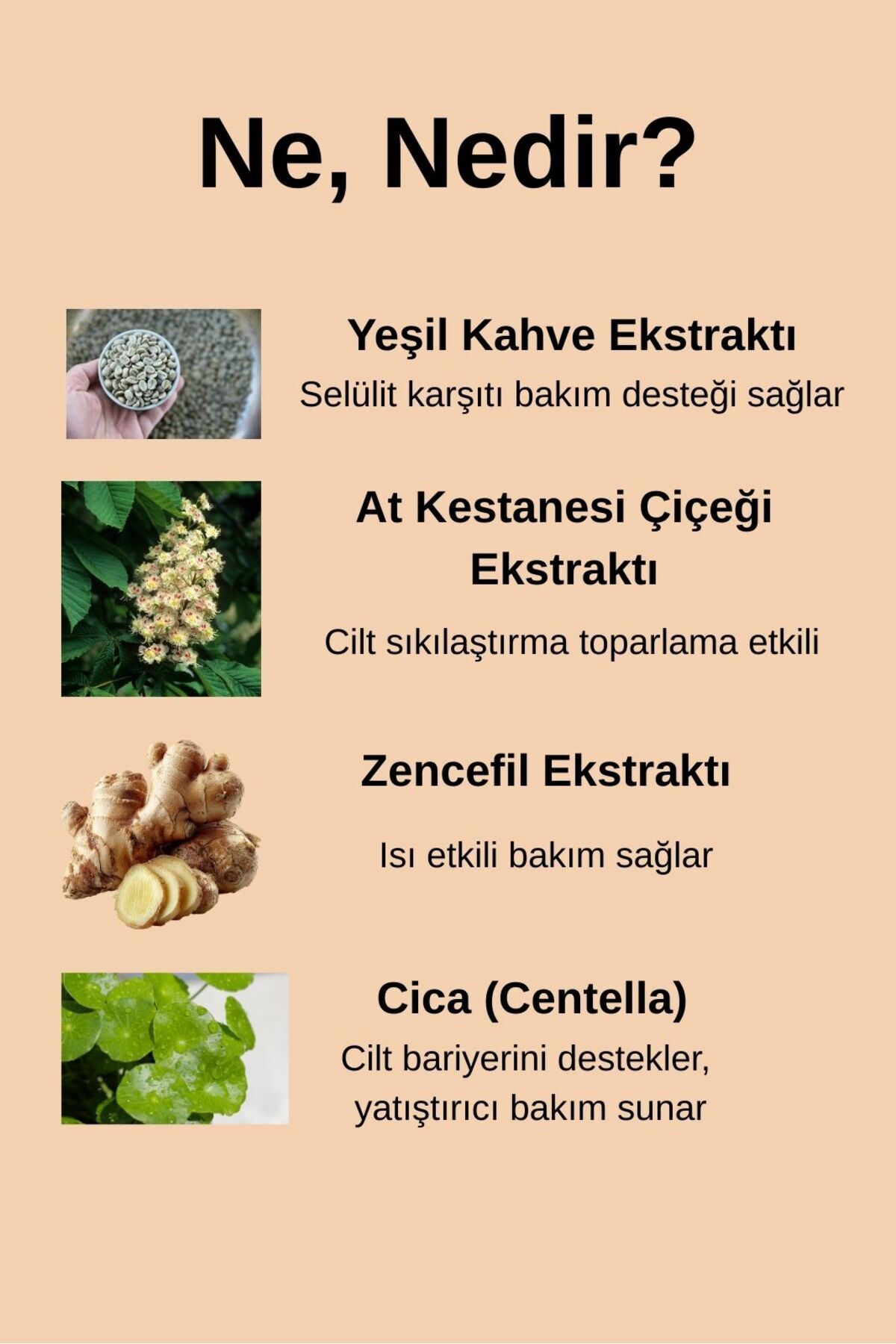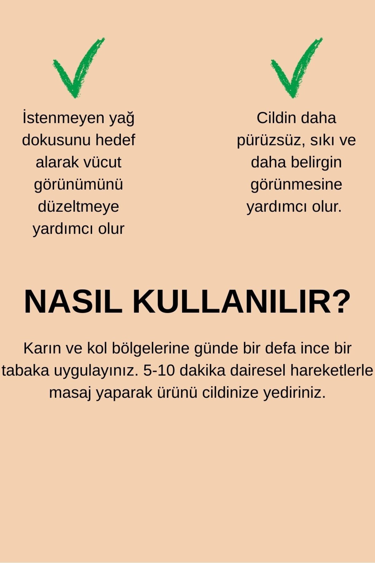 Karın ve kol sıkılaştırıcı jel arayanlar için özel olarak geliştirilmiş selülit karşıtı vücut toparlayıcı jeldir.; Düzenli kullanımda karın bölgesinde sıkılşma, kol bölgesinde toparlanma ve daha pürüzsüz bir cilt görünüm sağlamaya yardımcı olur.; Yeşil kahve özlü jel formülü sayesinde cilt görünümünü desteklerken, aescin ve zencefil içeriği ile sıkılaştırıcı bakım sunar.; Hafif yapılı vücut jeli, hızlı emilir, yağlı ve yapışkan his bırakmaz.; Kimler için uygun? – Karın sıkılaştırıcı jel arayanlar – Kol içi sarkma için toparlayıcı jel isteyenler – Selülit karşıtı vücut jeli arayanlar – Sporla beraber vücut toparlayıcı bakım isteyenler.; Kullanım Önerisi: Karın ve kol bölgesine yeterli miktarda jel uygulayın.; Dairesel masaj hareketleriyle tamamen emilene kadar yedirin.; Düzenli kullanı, karın sıkılaştırıcı ve selülit karşıtı etkiyi destekler.
